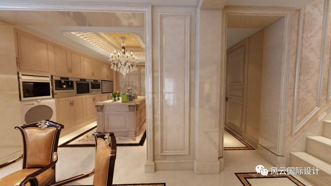 厨房造型奢华典雅,在吊顶造型上,以方形围合层次分明的石膏吊顶,再以中间点缀水晶吊灯,形成区域的视觉中心,在平面又以欧式橱柜组合烘托出端庄、典雅、大气的欧式气息,给人以唯美的享受。