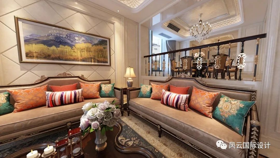 在色彩选择上以清新色调为主,通过复古造型款式的相互搭配,营造温馨、浪漫的家庭气氛。在家具装饰品的选购上,选择经典欧式元素的家居,搭配一盏柔和的水晶吊灯,展现了整个空间的格调,同时也给整个空间带来了浓厚的浪漫、温暖气息。