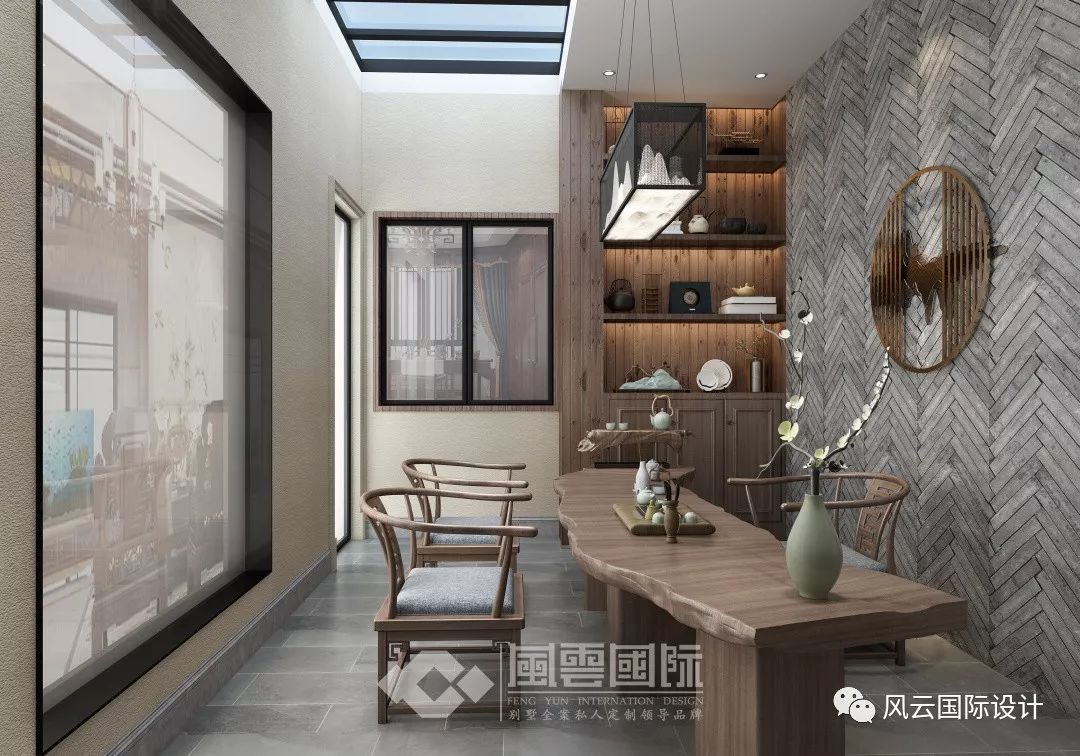 茶室方面,以高度开放的形式,去呈现恢宏的气度。设计上,相较客餐厅而言,茶室的设计多了一份欧式的现代韵味,主墙运用装置艺术的陈设布置,透过墙与物品的层叠感,达到借景丰富空间的作用,也为室内增添了浓郁的奢华与幻想。