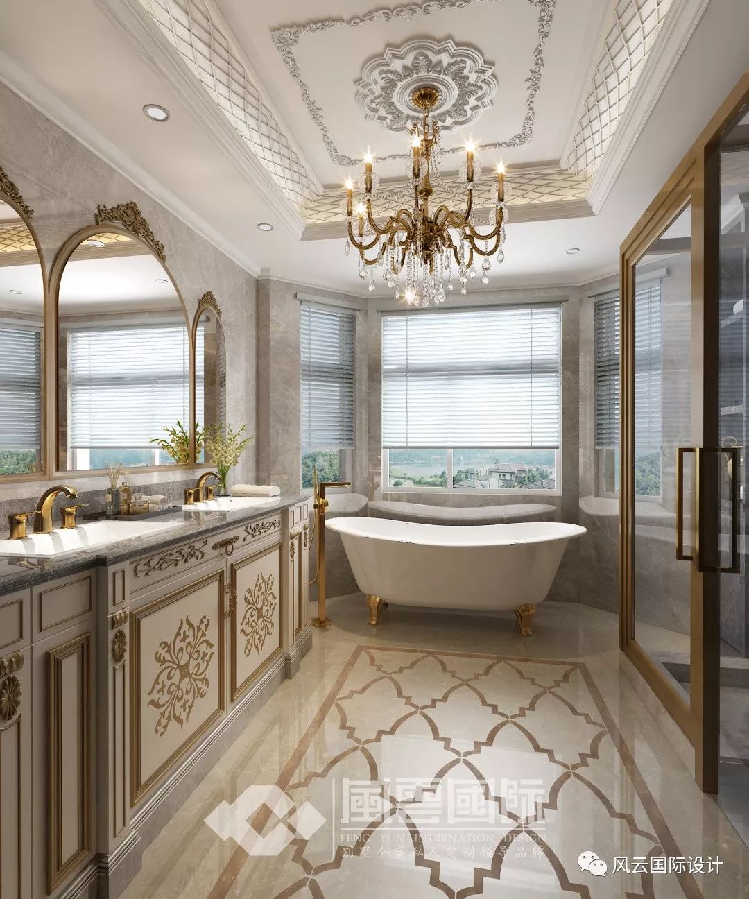 卫生间以象牙白墙砖奠定这个空间的高贵色调,白色的法式家具优雅的轮廓摆放其中相得益彰。柔和而温暖的灯光赋予整个卫生间装修设计明快的色彩流畅感。