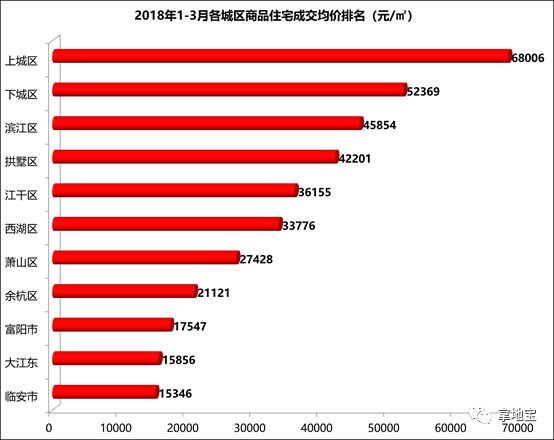 在2018年1-4月成交情况中,上城区商品住宅均价较高,均价为68006元/㎡,下城区成交均价排名第二,为52369元/㎡,滨江区以45854元/㎡的均价位列第三名。临安市成交均价为15346元/㎡,位于榜尾。目前杭州所有区域的住宅价格均价维持在15000元/㎡以上。