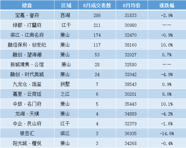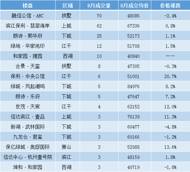 8月酒店式公寓成交中,价格上涨的楼盘比下跌的楼盘高出一半多,德信·时代之心、龙湖·西溪天街,三万七八的价格,签约量超超百套,另外还有绿城·凤起潮鸣、保亿绿城·奥邸国际等高端产品签约,其中华联·UDC时代签约均价高达90698元/㎡,远超绿城·凤起潮鸣。