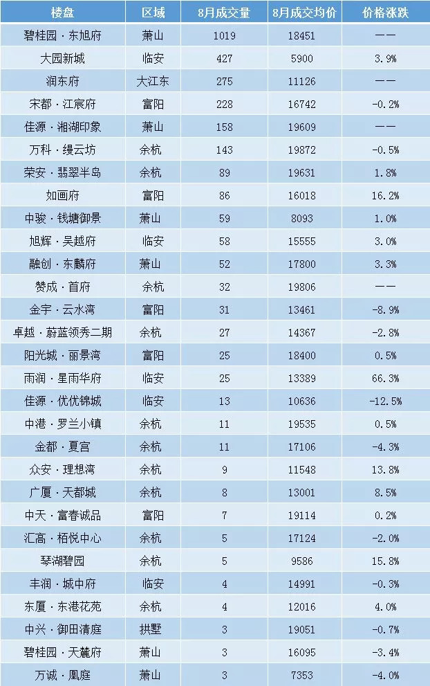 据快房网K指数研究室数据,8月1日-8月30日,杭州(含富阳、临安)共有231个新房住宅项目有成交情况,与上月相比,减少30余个。8月新房住宅共成交7640套房源,成交价均价24560元/㎡,量价齐跌,成交量下滑22%,价格微跌400多元/㎡。