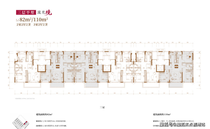建面约82㎡2房2厅2卫/110㎡3房2厅2卫(三层上叠):