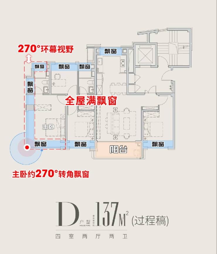 户型优势:约 137㎡四房侧向横厅设计,面宽达 6.4 米,7 飘窗 + 半封阳台,赠送面积约 20㎡。