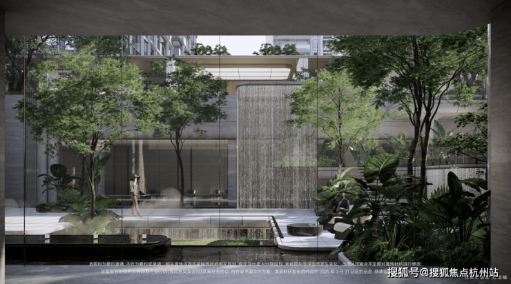 下沉式庭院,通过垂直景墙、悬浮观景台与叠水景观的立体交织,实现移步换景的视觉效果,也与会所空间形成无界交互。
