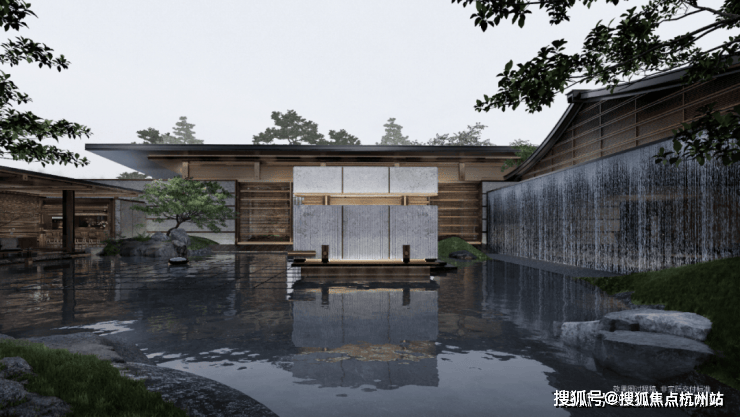 二来,突破传统围合式的中式园林。采用 引水入园 方式,设置了多重院落空间+巷道景观,巷门-水苑-私院的格局,整体分而不隔、层层嵌套。