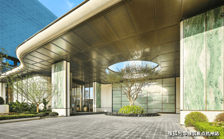 这处门庭采用贝金米黄石材、维多利亚绿、白雪公主奢石,结合古铜色金属板,形成冷暖撞色的张力美学,打开了城市奢度,每个细节透露出“贵”。