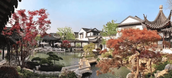上海桃花源,在繁华与生态的交替中,营造中式庭园!还原上海地理特色的江南园林为建筑形式,以符合上海城市恢弘气度的皇家园林为布局规制,形成了上海桃花源特有的“南形北制”河道环绕的规划特征!