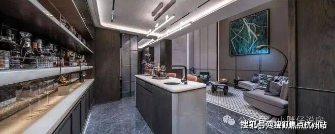 冰箱走出厨房,也为厨房留下更多发挥空间。采用可开可合的开放式设计。岛台侧面运用部分香格里拉白石材,搭配侧面开放式置物架和储物抽屉,台面也配备隐藏可升降插座。