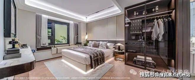 主卧套房 自成独立世界,尤其是建面约135㎡创意展示空间内复杂花形拼接手法的实木复合地板通铺,所付出的成本无需赘述。主卧、次卧顶部吊顶四个角采用圆弧倒角的造型,并且顶部都采用了磁吸轨道灯。