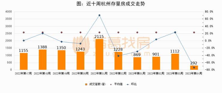 存量房方面,第04周杭州存量房成交292套,较上周减少820套,环比下降73.7%。从近十周成交走势来看,周均成交套数为1165套,本周低于平均水平74.9%。