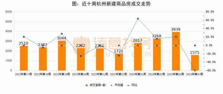 进入2023年第04周(01月16日-01月22日),杭州新建商品房成交1575套,较上周减少2364套,环比下降60%