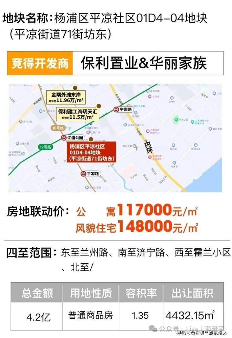 2023年12月,第四轮土拍中,由华丽家族和保利置业强强联手以总价41885万元,拿下了杨浦区平凉社区01D4-04地块(平凉街道71街坊东),容积率1.35,溢价率0%,楼板价70002元/㎡,装修标准不低于40000元/㎡,房地联动价公寓117000元/㎡,风貌住宅148000元/㎡。