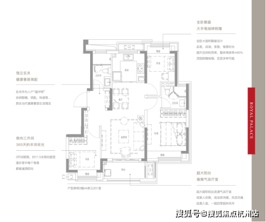 90㎡的三房,三开间朝南,南北通透,全明户型。入户玄关设计,可放置鞋包、保护了主人的隐私;主卧套房设计,卧室全飘窗设计。整体来说,这个户型设计符合当下的市场需求,没有硬伤。