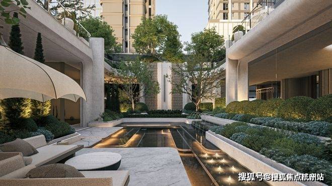 下沉庭院绿意与水系交织,泳池、健身、瑜伽……多种会所功能环绕。地面风雨连廊串联到不同单元入口,即便是到了门口,也有秘境花园静候归家。