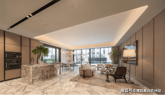 一楼:消除空间边界,南向花园、海派会客厅、餐厨天地形成大尺度活动公区。罕见多面采光与超大落地观景窗,将感官持续放大,饱览海派繁花时,也让花园风光成为私董会晤、文艺沙龙的绝佳谈资。