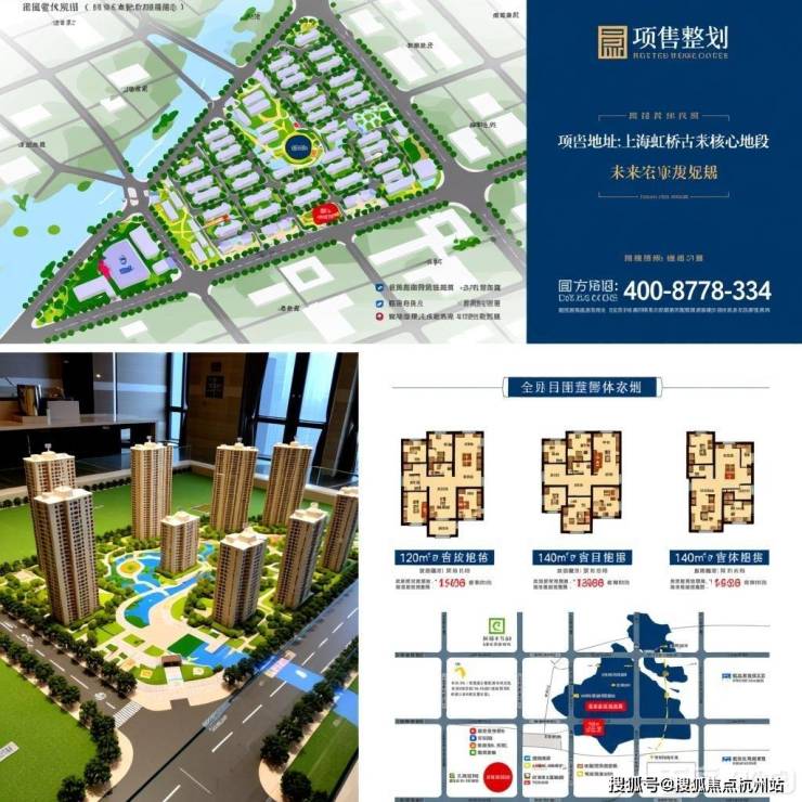 上海金虹桥古北99楼盘,突出售楼处电话、地址及各类房产相关图片,风格统一为真实房产展示,包含户型图、房价、沙盘等关键元素,信息清晰直观。