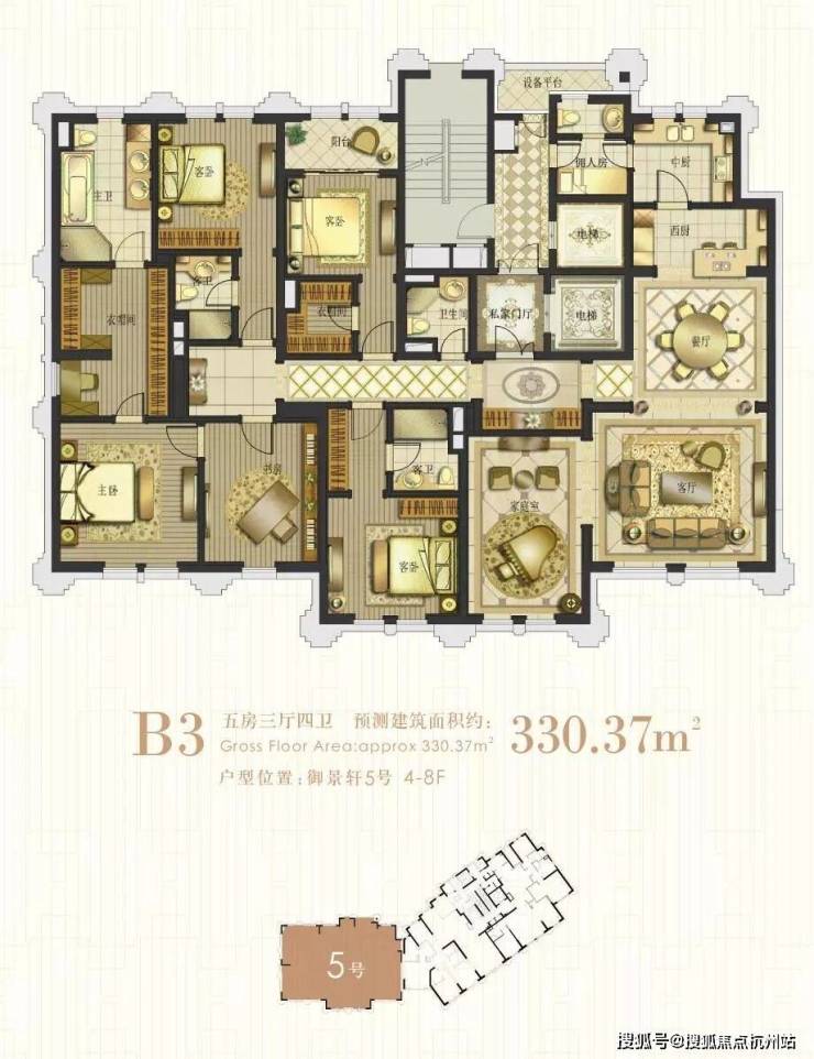 5号楼01室:330㎡6房3厅4卫,客厅朝南,四房朝南,两房朝北。