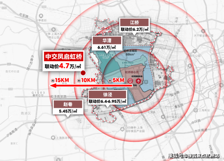 而中交凤启虹桥,距离虹桥主城区直线仅约2.8公里。