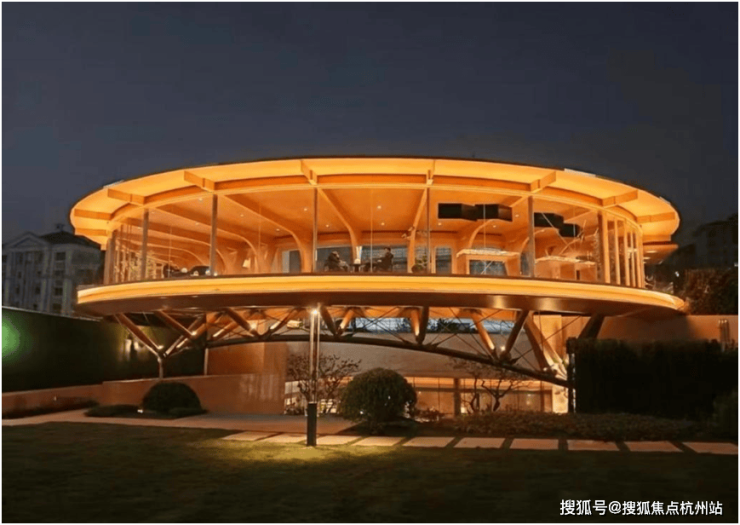 搭配作为会所标志性景观的360°钢木结构悬浮廊桥,打破传统景观平面化局限,造型轻盈灵动,将会所与社区园林、墅居建筑群自然串联,既实现360°无死角观景,又成为业主休憩、社交的专属空间。