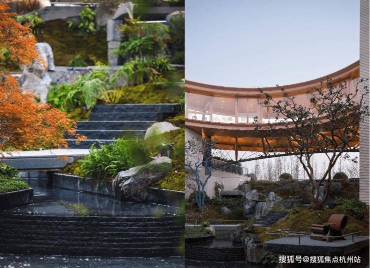 项目约450㎡开阔水院如天空之镜,下沉庭院飞瀑流觞,甄选百年红果冬青、染井吉野樱、羽毛枫、桃树等名贵树种,三季有花、四季有景,行走其间,流水叮咚、绿意盎然,宛若置身千年桃花源。
