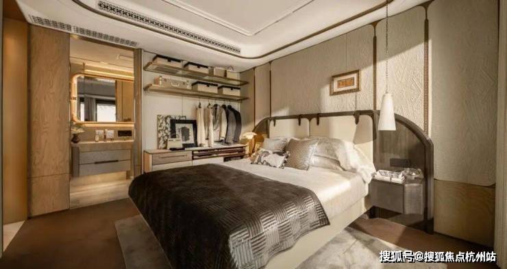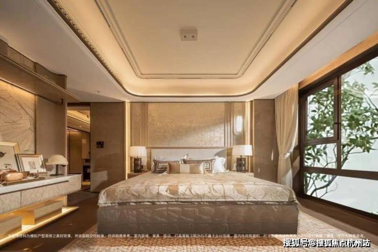 主卧标配约4.6米超大面宽贝母马赛克弧形皮革背景墙,地面采用和保利世博天悦同款的嵌铜荷叶拼地板,且嵌铜花色可以选择。