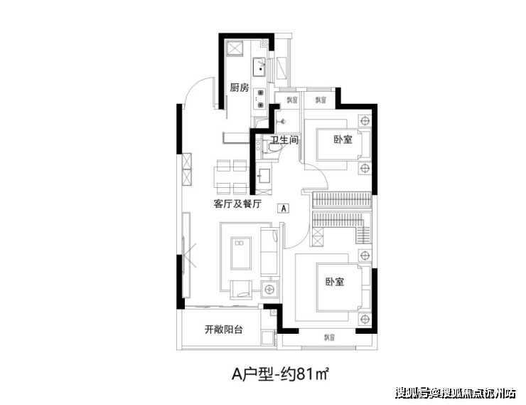建面约81㎡2房功能齐全,拥有朝南大面宽和全卧飘窗设计。