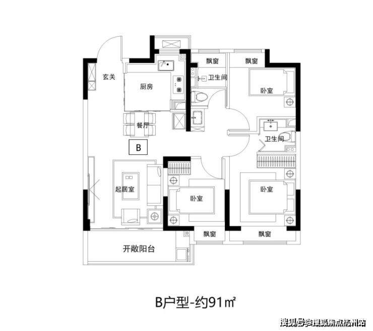 建面约91㎡3房2卫,三开间朝南,客餐厅连通大阳台,四飘窗设计,好户型该有的素质它都有。
