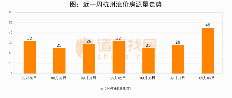 根据诸葛找房数据显示,杭州24小时涨价房源量为45套,较09月04日增加17套,环比上涨60.7%。与此同时,涨价房源占比小幅扩大,业主信心有所提升。