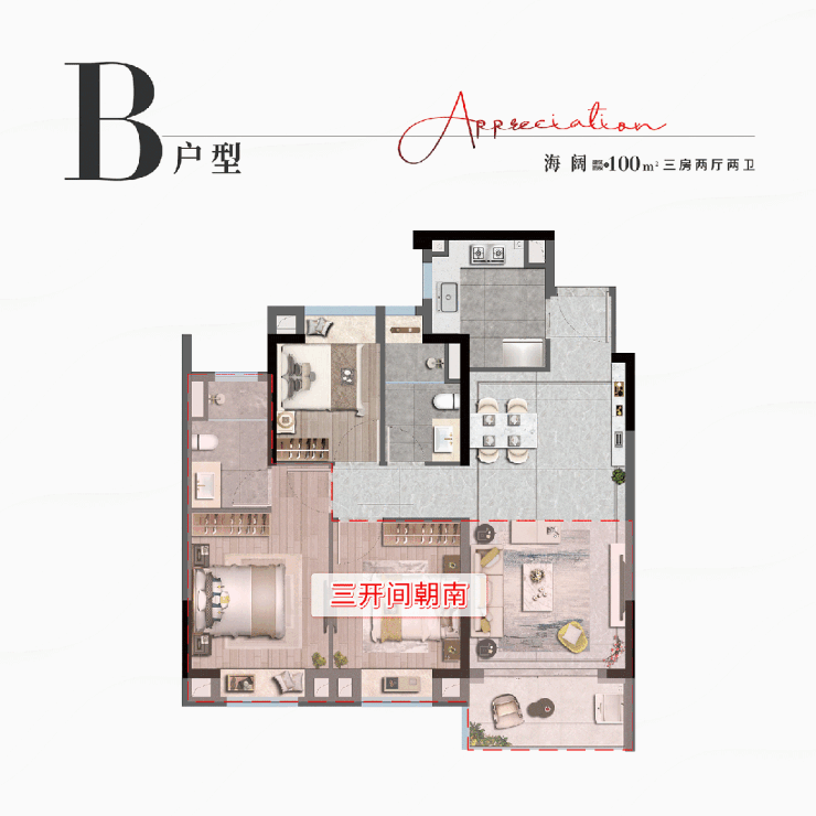 其中,约100平3房南向三开间设计,餐厅客厅阳台一体化设计,放大了社交空间的尺度感,也让空间利用率更高。