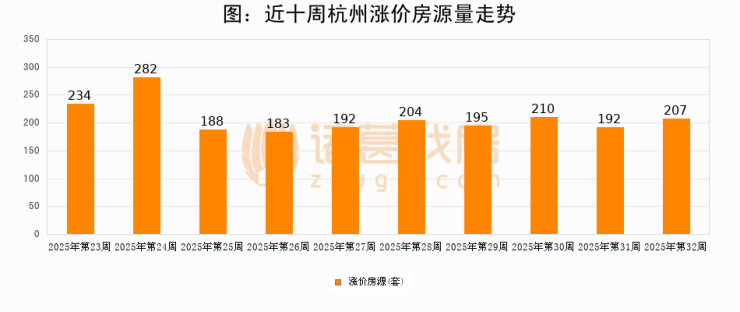 从调价房源来看,第32周杭州涨价房源207套,较上周上涨7.8%。与此同时,32周涨价房源占比提升0.54个百分点,业主信心持续恢复。