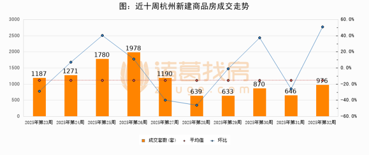 进入2025年第32周(08月04日-08月10日),杭州新建商品房成交976套,较上周增加330套,环比上涨51.1%