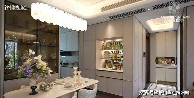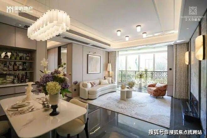 重点看细节:项目整个餐客厅均为岩板交付,岩板的尺寸达到了2.4米*1.2米,这是市面上非常罕见的大板配置,即便是市区豪宅,用的大尺寸也不过是1.8米!入户地面采用三种石材拼花,材质完全不输市面顶豪。