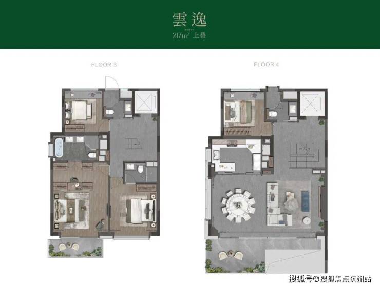 先看3-4层的主体空间。和其他常规上叠3层会客厅+4层起居室不同,项目将会客空间放在了4层,这是为了和顶层露台会客聚会功能整合在一起,形成更加合理的动线。