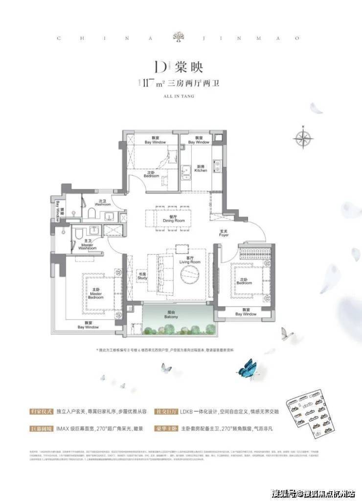 建面约117㎡3房2厅2卫 ,做到了 3+1开间朝南+5个飘窗+主卧套房设计+270°转角飘窗, 所有的尺度都有进一步提升。