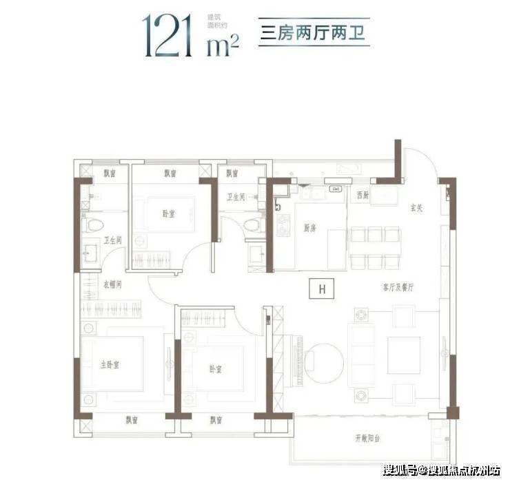 户型特点: 3开间朝南,全屋阳光充足;L型厨房转角移门设计,最大化空间视野;四飘窗设计,通透空间享受;动静分区,亲密有度;套房式主卧,容纳私谧生活点滴;