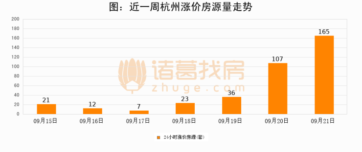 根据诸葛找房数据显示,杭州24小时涨价房源量为165套,较09月20日增加58套,环比上涨54.2%。与此同时,涨价房源占比小幅扩大,业主信心有所提升。