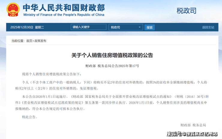 12月30日,财政部、税务总局发布《关于个人销售住房增值税政策的公告》,个人(不含个体工商户中的一般纳税人)购房不足2年的住房对外销售的,增值税率由原来的5.3%降至3%。购房2年以上的住房对外销售的,免征增值税。