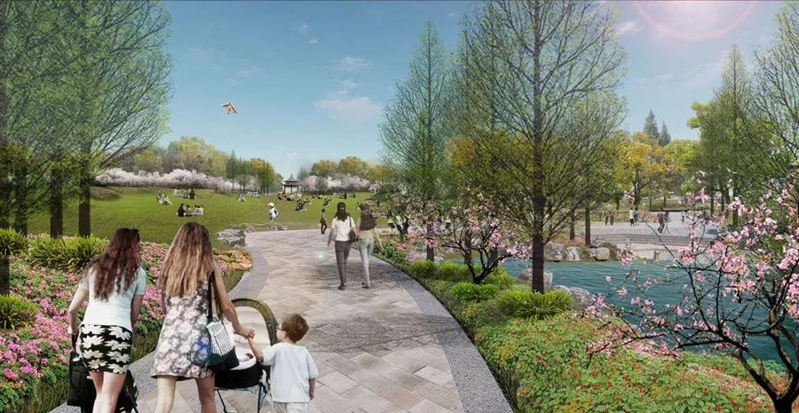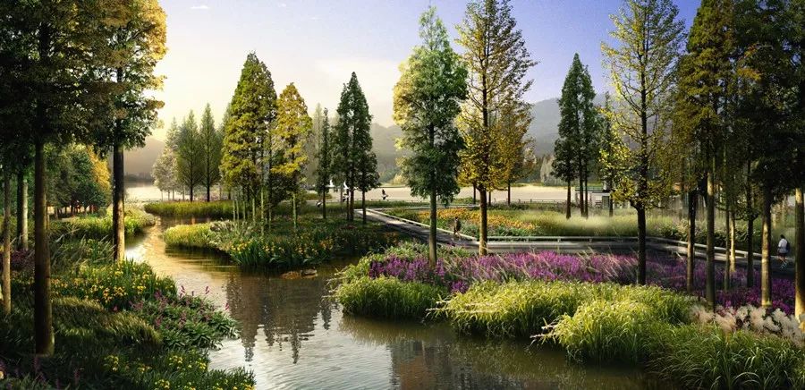 该园区定位为生态护育区通过局部打通水面,形成滩地方便市民游客水上游览种植多种水生植物,营造水上花海的效果