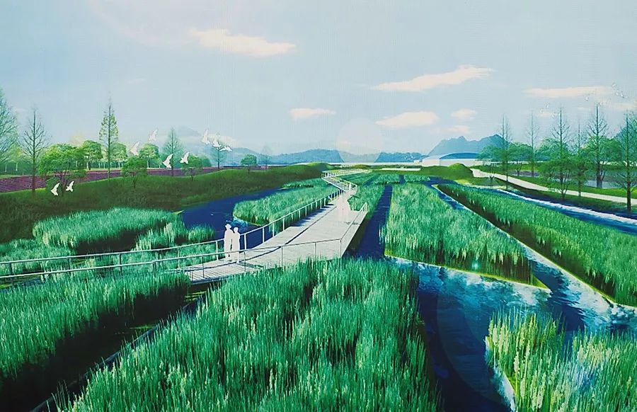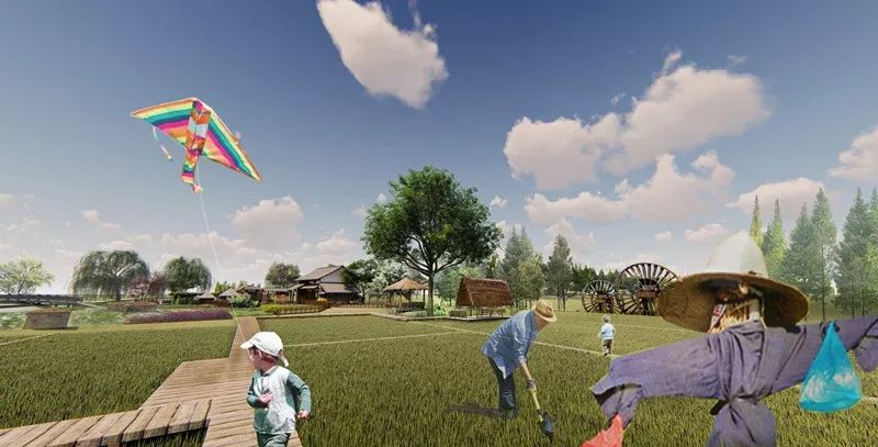 该园区作为稻作文化体验区将保留现有农田增设休息平台、架空栈道、亭廊休息空间让市民游客感受田间野趣