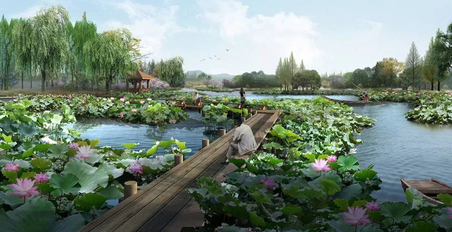 该园区以荷花为主题设置亲水平台、水上栈道、景观塔等给市民游客带来优质的赏荷体验通过在岸上、岸边分别种植乌桕、荷花打造水上森林的景观效果