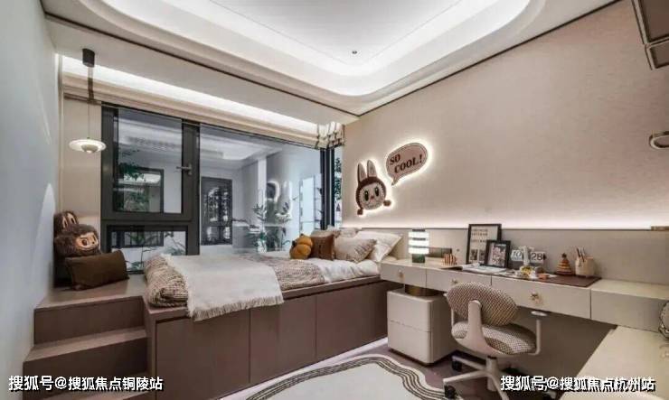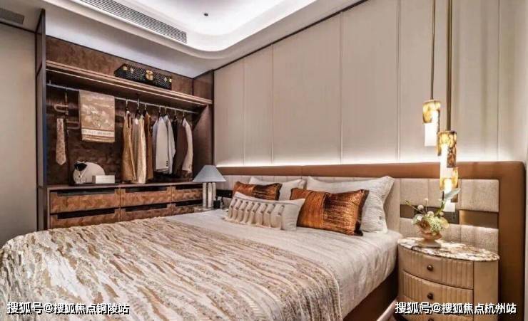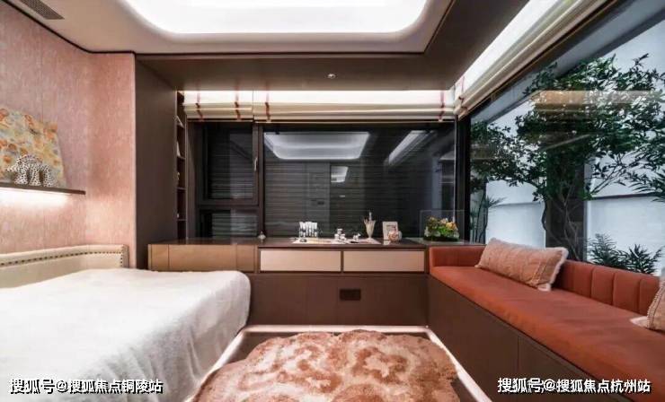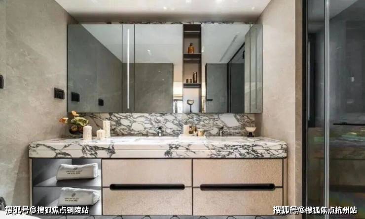 另外采用意大利“大花白”天然石材实现地墙满铺,双台盆与双镜柜的对称设计复刻五星酒店规制,美妆冰箱精准控温呵护护肤品,奢华至极!