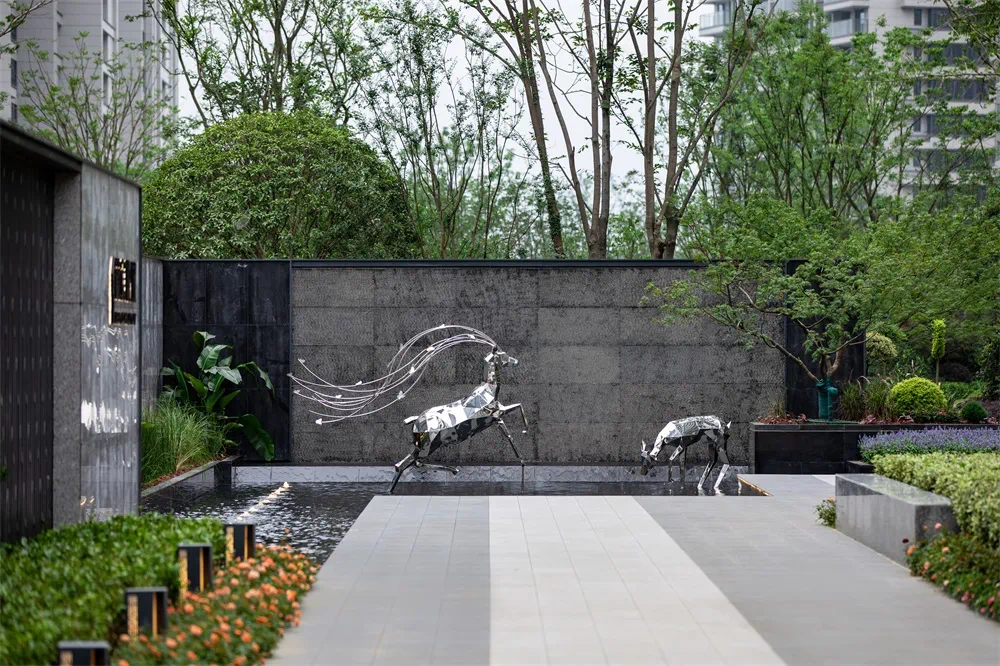 从东门进来后漫步在银杏大道,祥鹿一跃而起,幼鹿悠然饮水,鲜花在侧,涌泉潺潺,水幕涟涟,槭枫摇曳,如置青山湖畔,如在水中森林,偶遇童话秘境中的白鹿,若童年匆匆一瞥,或成年梦中恍然初见。