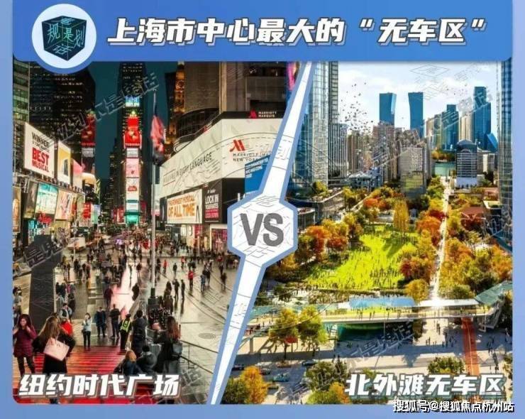 上海市中心最大的“无车区”:北外滩对标纽约时代广场的纯步行区,打造约0.2平方公里的“无车区”,也是上海市中心最大的“无车区”。依托“藏在地下”总共三层的“循环车库”,将车流直接由地面带进地下环路,减少地面交通。