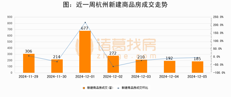 根据杭州市住房保障和房产管理局数据显示,2024年12月05日杭州新建商品房成交185套,较昨日减少7套,环比下降3.6%