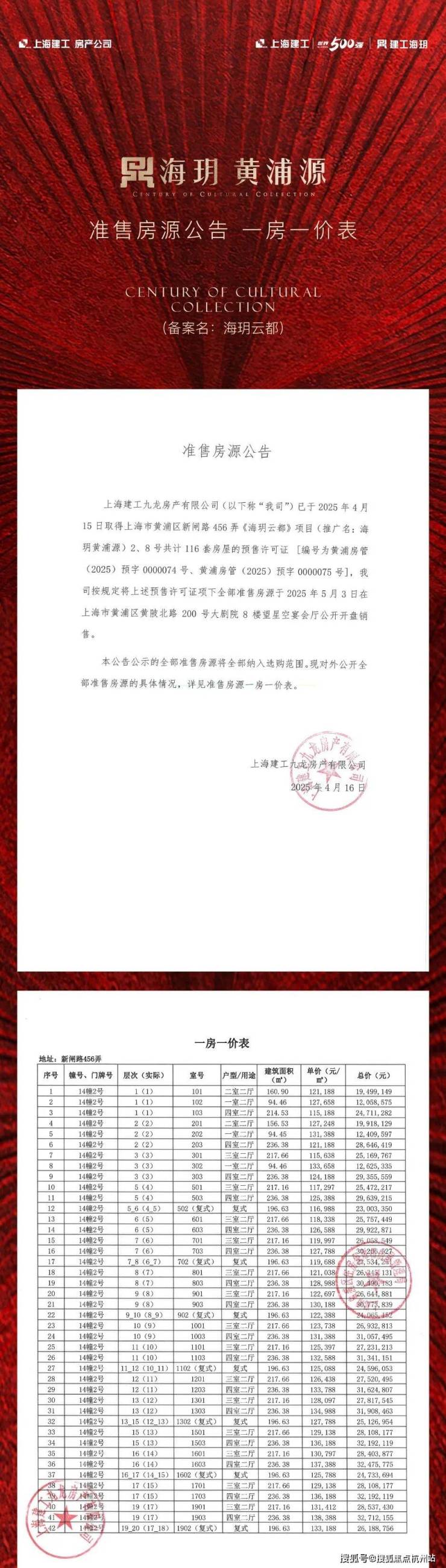 黄浦区「海玥黄浦源」少量建面约196-402㎡多种户型;均价14.56万/㎡