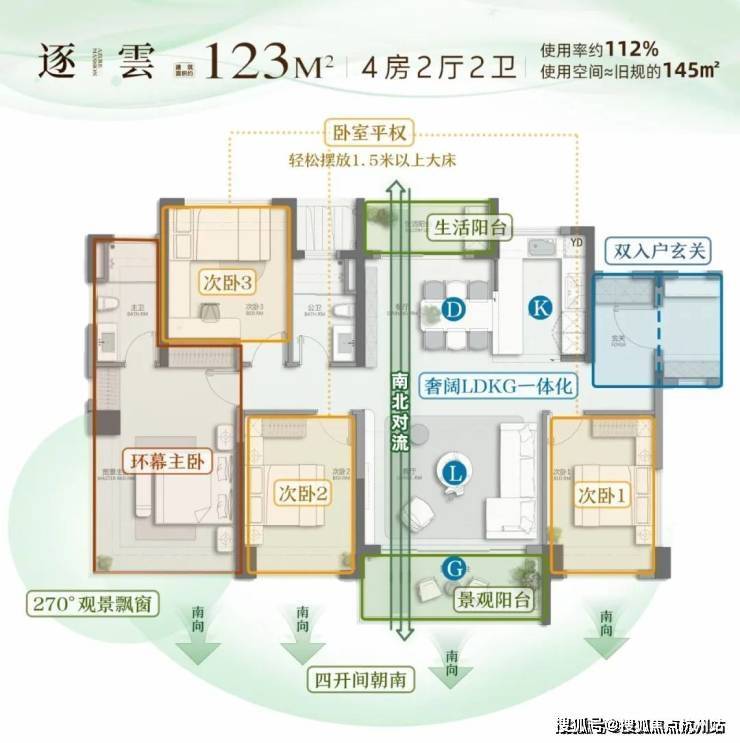 123㎡户型实现四房两厅两卫设计,采用南北双阳台、双玄关布局,最小卧室面积超11㎡,轻松摆放1.5米大床加床头柜,实现了“卧室平权”的理念。这一户型的使用率高达112%,相当于旧规约145㎡户型的空间体验。