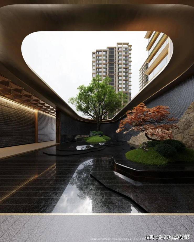 山水长卷的隐奢门庭:取意豫园中式园韵,打造约 99 米隐奢入口空间结合独立的车马院,风雨廊道与人车分流独立双入口,带来尊贵的归家体验。