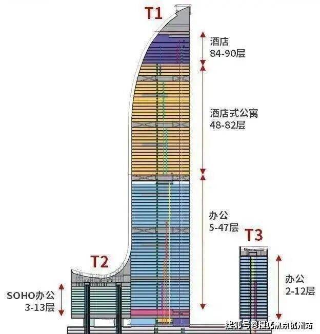 T1主塔楼是集办公、公寓、酒店为一体、高450m高的超高层综合体;T2塔楼位于T1塔楼西侧并与之相连,高80m的板式建筑,主要功能为SOHO办公;T3塔楼位于T1塔楼南侧,高74.5m,主要功能为办公。